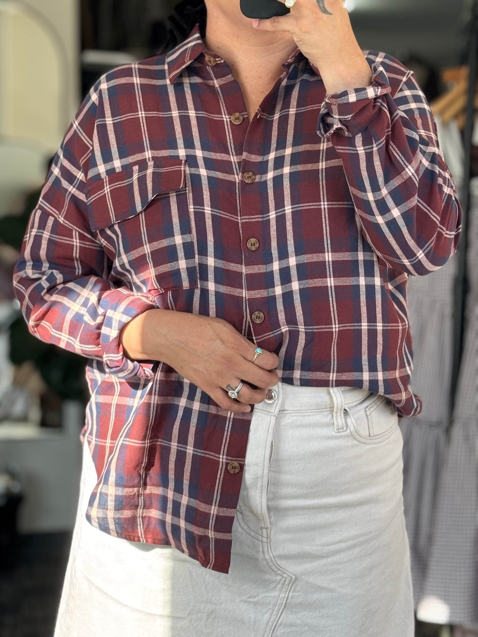 Blu Pepper Plaid Button Down Pocket Detail Long Sleeve Shirt