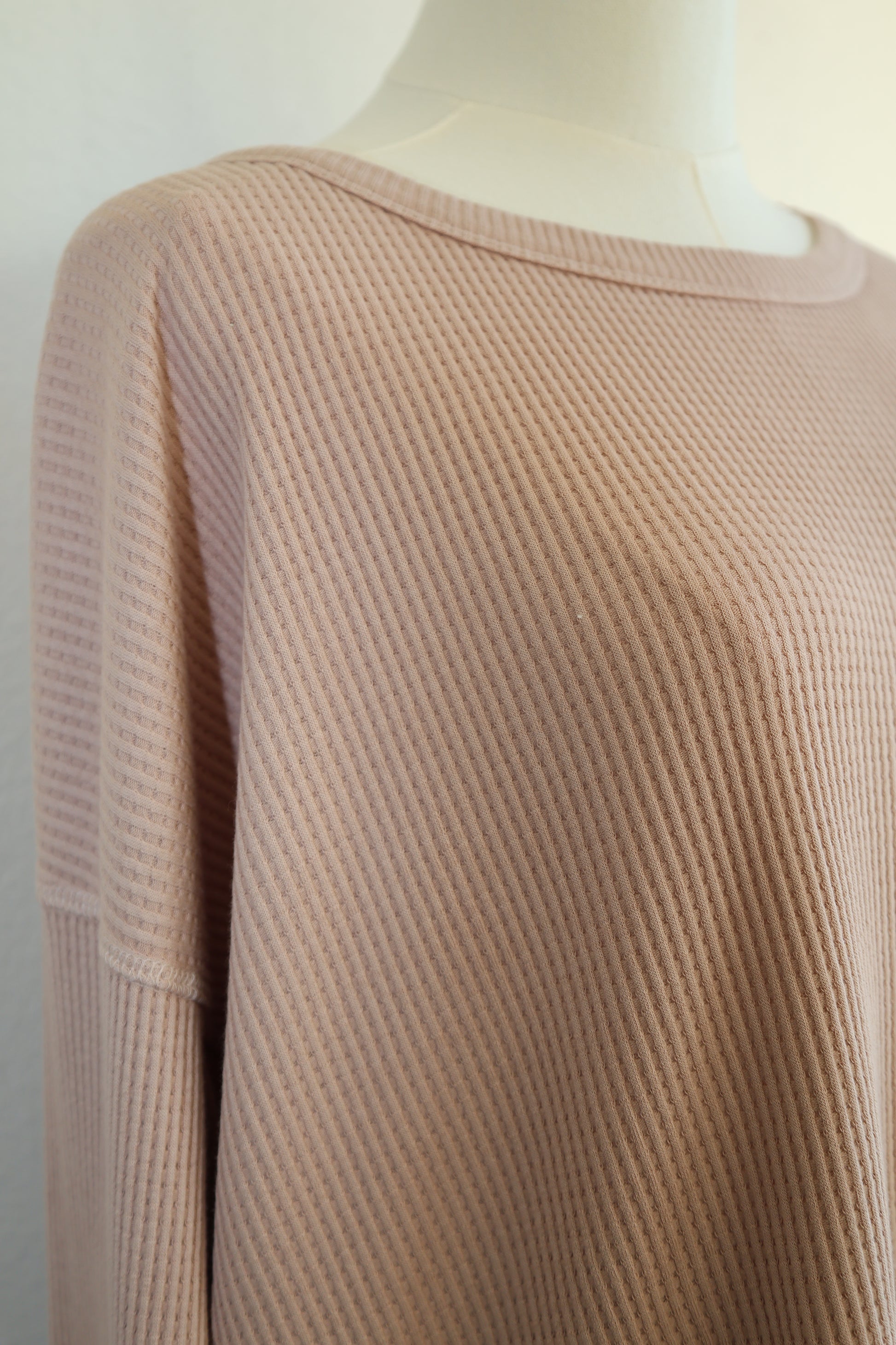 Knit Cotton Spandex Thermal Scoop Neck Drop Shoulder Long Sleeve Top with Side Slits