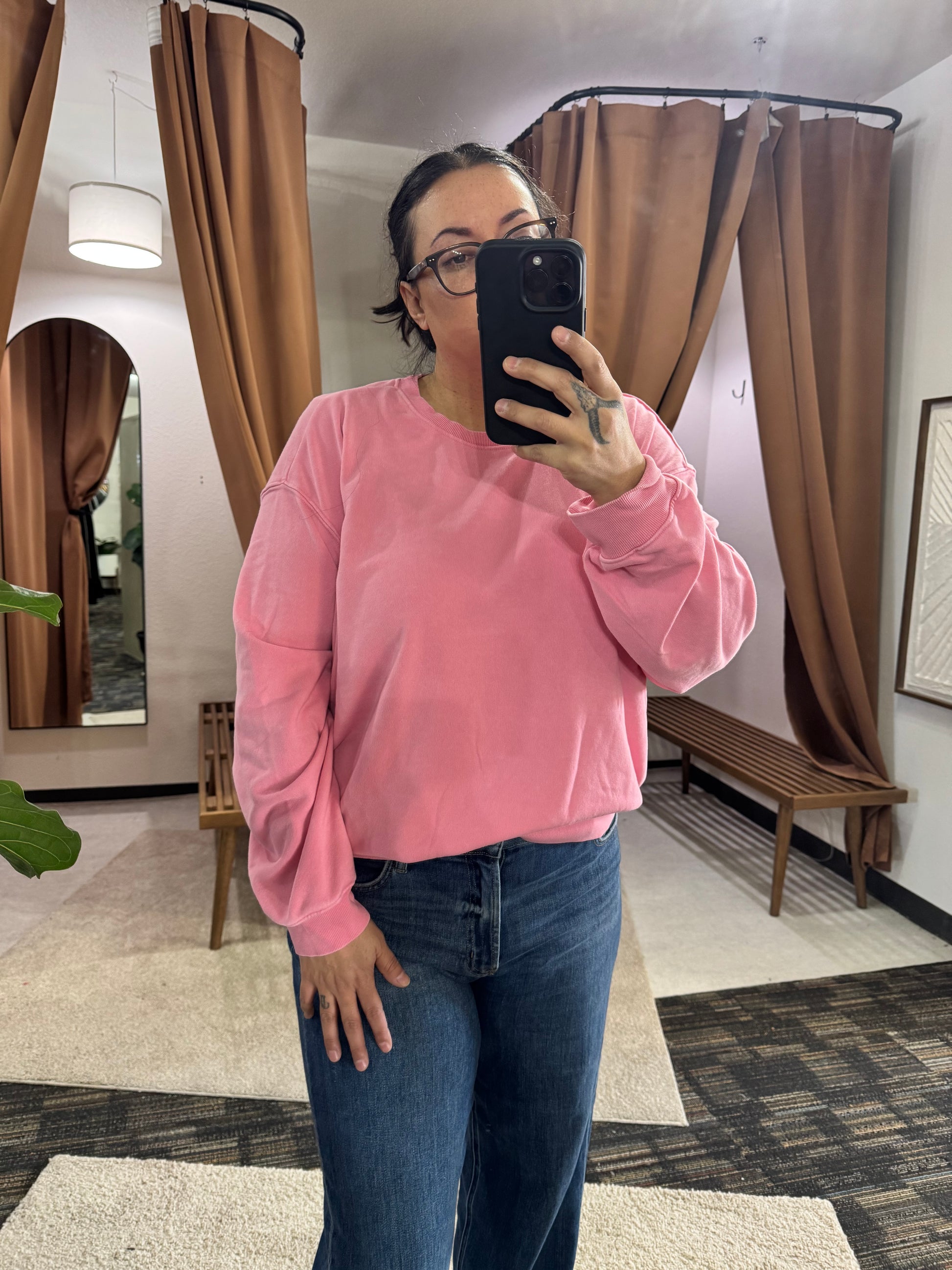 Cerena wearing a size small shown. This essential sweatshirt offers ultimate comfort with soft French terry, featuring a mineral washed finish providing a faded, vintage texture. The design includes a ribbed crew neckline and dropped shoulders with full long sleeves and ribbed cuffs. With an oversized and relaxed fit, it pairs perfectly with joggers and sneakers for a laid-back look. Self : 80% Cotton / 20% Polyester Contrast : 95% Cotton / 5% Spandex Imported. Designed In The USA
