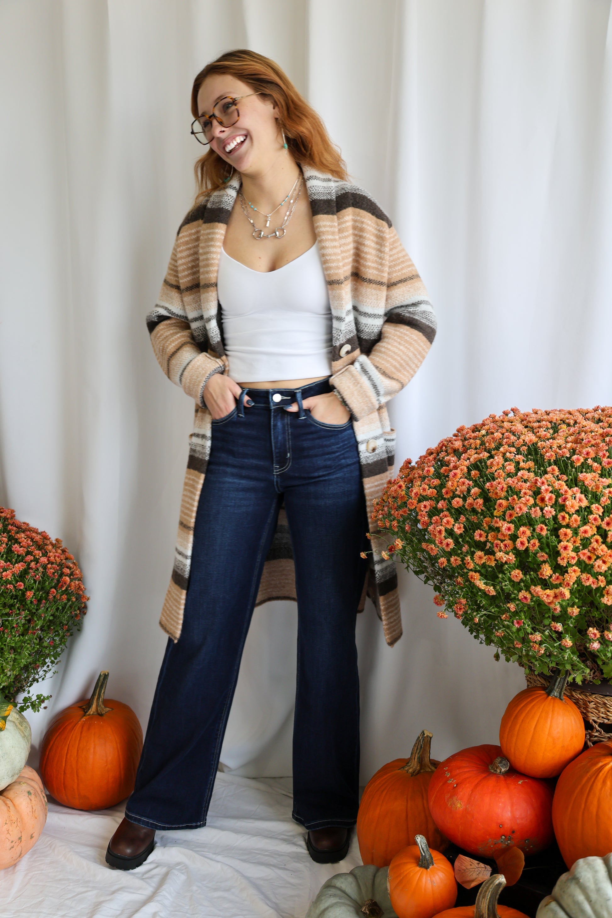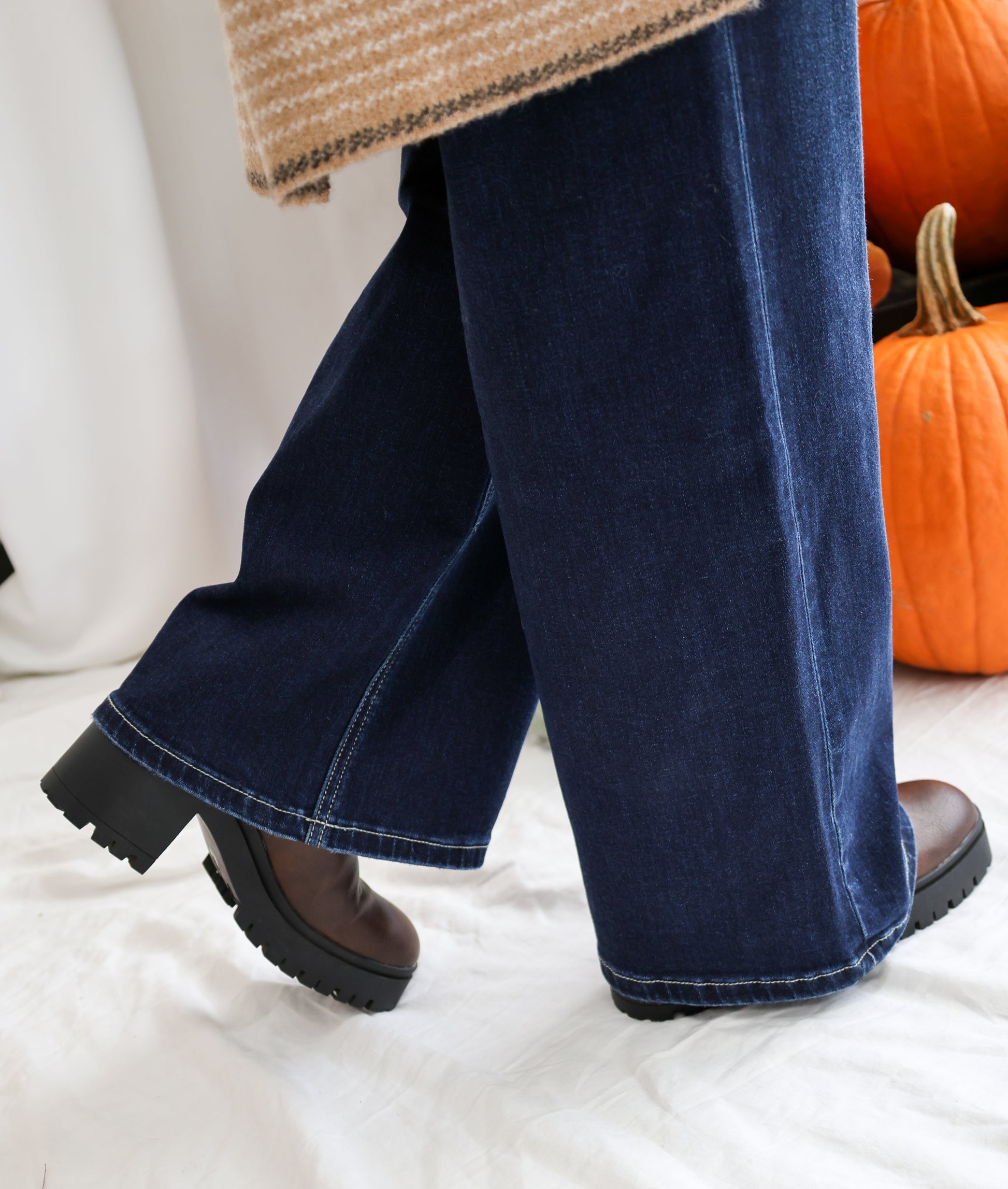 HIGH RISE DARK WASH FULL LENGTH WIDE JEANS COMFORT STRETCH DENIM, HIGH RISE WAIST, FINISHED HIM, FULL LENGTH, WIDE JEANS F. RISE: 10 1/2" / INSEAM: 33" / LEG OPENING: 22"