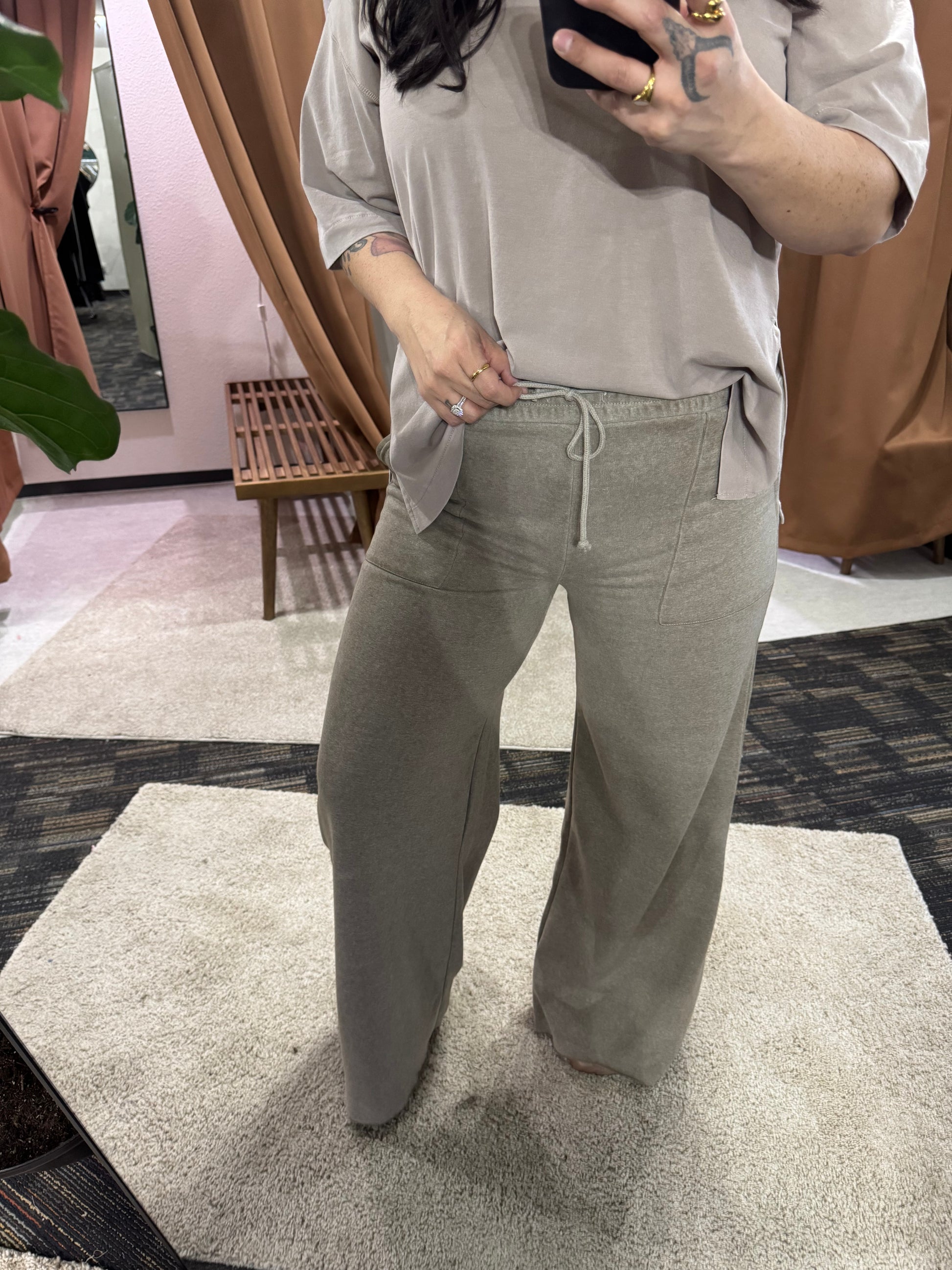 These contemporary pants are crafted from soft burnout washed french terry, featuring a flattering high-rise elastic waistband with a functional drawstring tie. The cut is a dramatic oversized wide-leg silhouette with prominent front-facing patch pockets. Pair with a cropped sweatshirt and chunky sneakers for a cozy, yet chic look. 51% Cotton 49% Polyester Imported. Designed In The USA