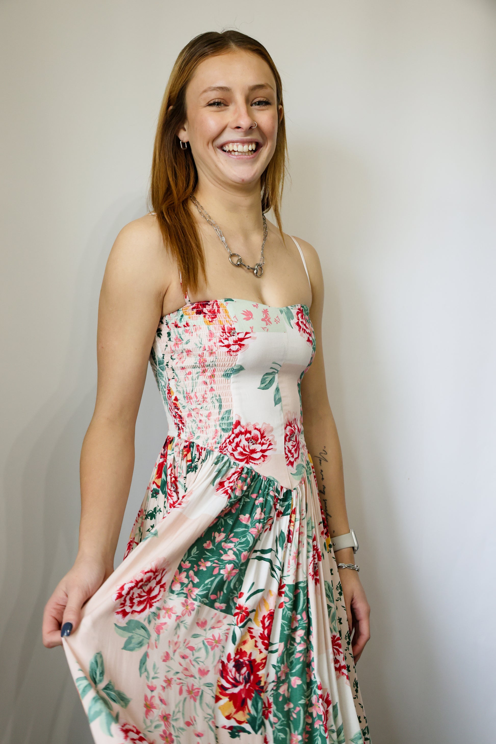 Floral Patch Print Square Neck Sleeveless Adjustable Strap Smocked Torso Midi Dress SELF:100%RAYON LINING:100%POLY *